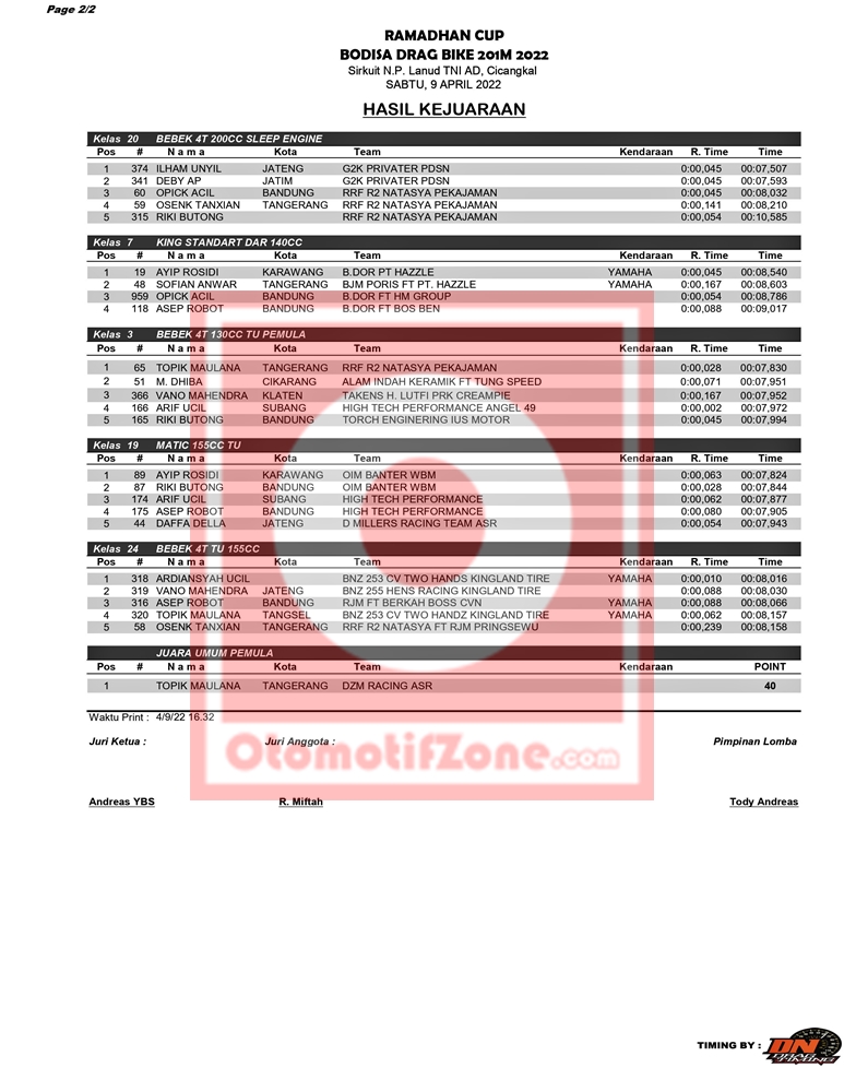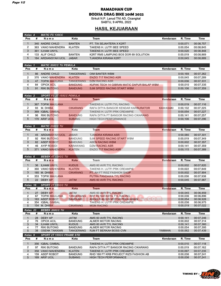 Lalu bagaimana dengan hasil keseluruhan yang lainnya? Penasara? Simak hasil lengkap dari gelaran Bodisa Drag Bike Ramadhan Race 2022, di hari Sabtu, yang berhasil Penulis rangkum.