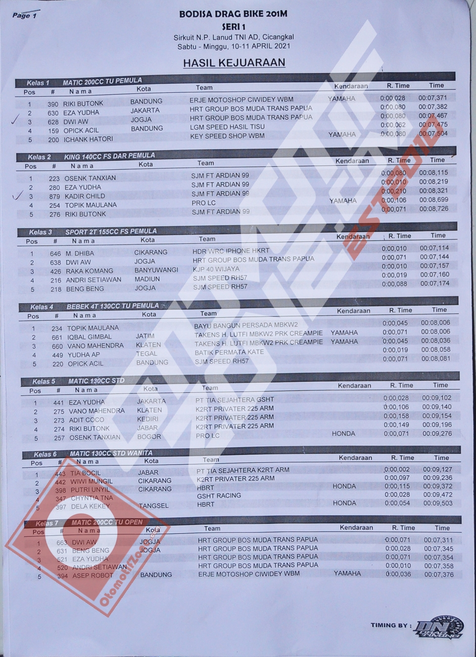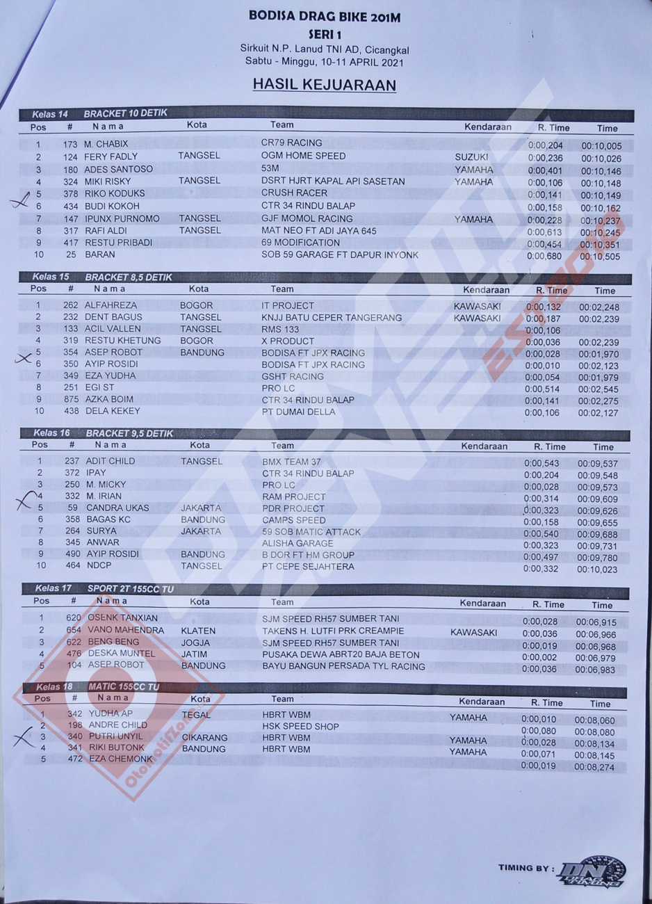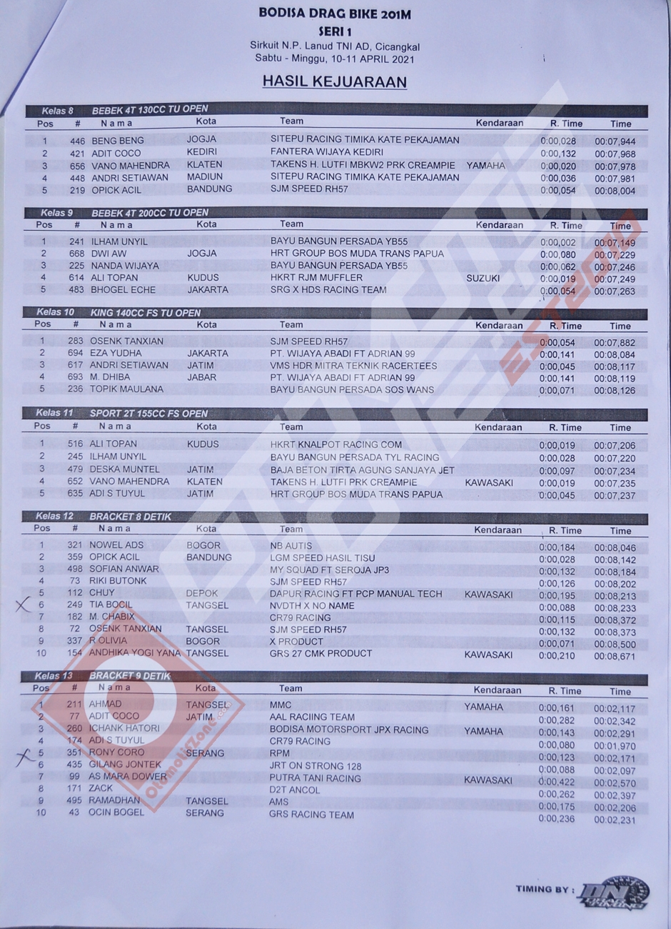 Bodisa melakukan 2 hari penyelenggaraan drag bike dengan melakukan pergantian kelas per harinya. Ini juga bertujuan untuk mengurangi tingkat para peserta yang hadir dalam arena Sirkuit.Berikut hasil yang dapat dirangkum oleh Penulis pada gelaran hari pertama drag bike Bodisa Motor Sport.