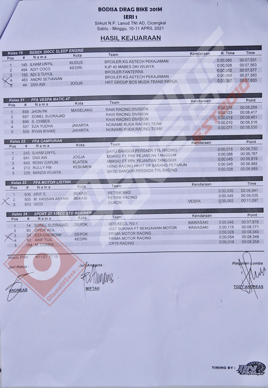 Otomotifzone.com – Tangerang Selatan. Usai sudah rangkaian acara kejuaraan drag bike yang digelar oleh Bodisa Motor Sport (10-11/4/2021). Sebanyak 24 kelas telah dilangsungkan di Sikruit NP TNI-AU Cicangkal, Rumpin, Bogor-Jawa Barat. Cuaca cerah mengiringi jalannya balapan besutan Haji Bahrudin bersama rekan-rekannya.