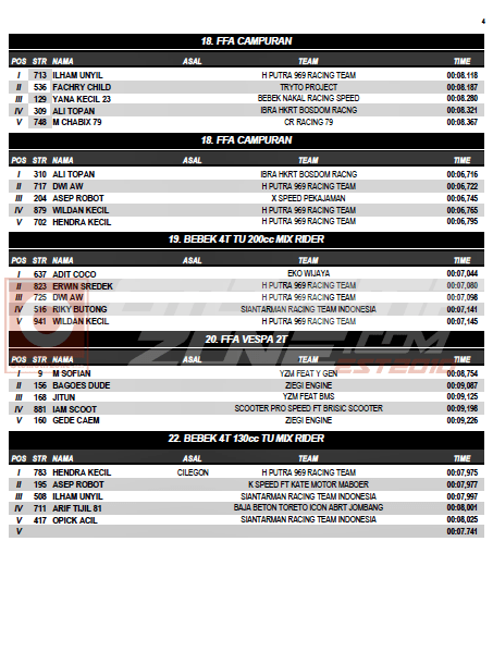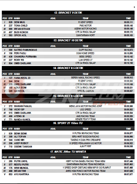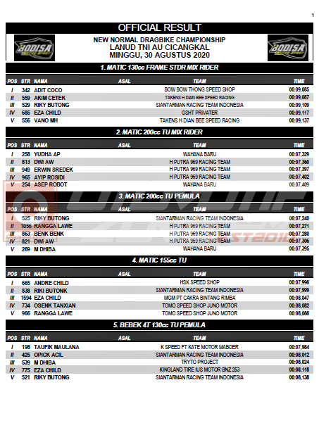 otomotifzone.com – Tangerang Selatan. Kejuaraan drag bike yang diselenggarakan Bodisa Motor Sport selaku event organizer telah berhasil diselenggarakan. Berbagai waktu tercatat oleh para pembalap menggunakan kuda besi andalannya, berikut hasil keseluruhannya: