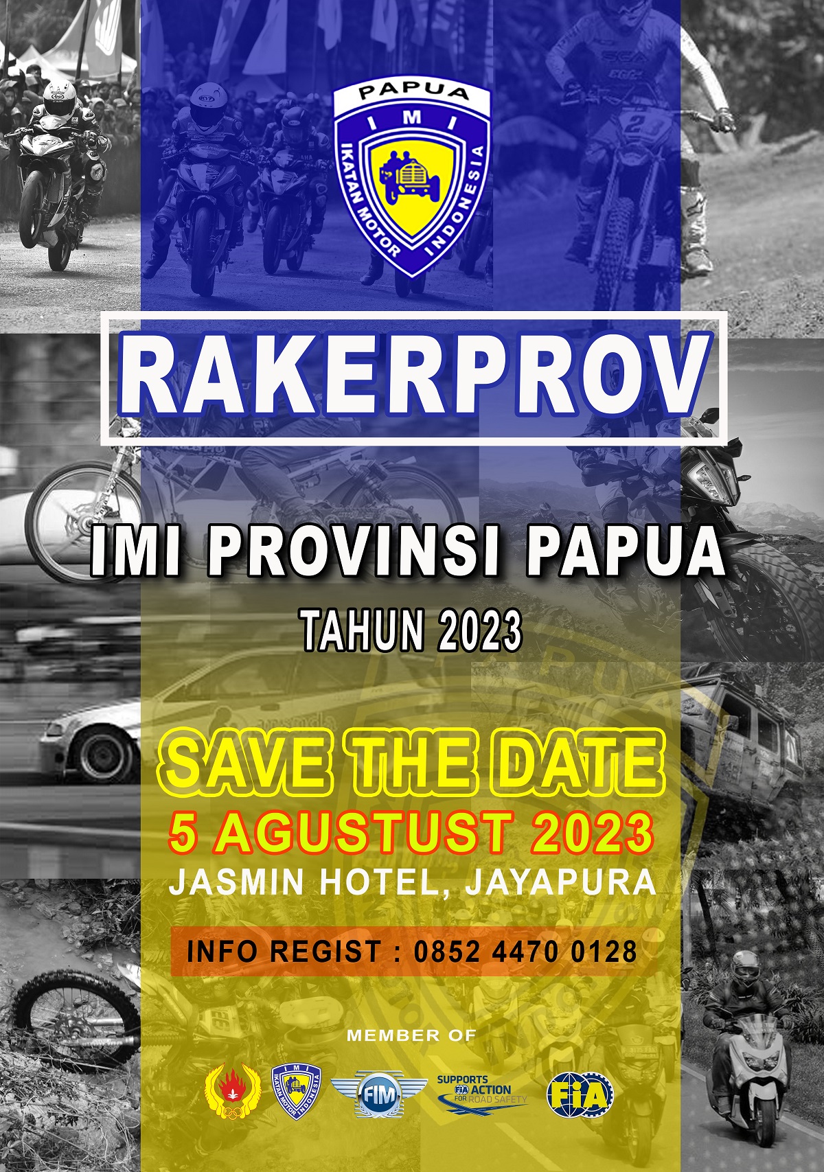 Sebagai informasi, tempat pelaksanaan Raker Pengprov IMI Papua tahun 2023 pelaksanaanya di hotel Jasmine Jayapura pada, Sabtu 5 Agustus 2023. Ketua penyelenggara juga telah berkomunikasi dengan Ketua Pengprov akan memberikan ruang dan berikan undangan kepada klub-klub sebagai peninjau. Namun seperti tujuan Ketua Pengprov di atas maka kebijakaan positif dapat diambil dengan syarat dan ketentuan.