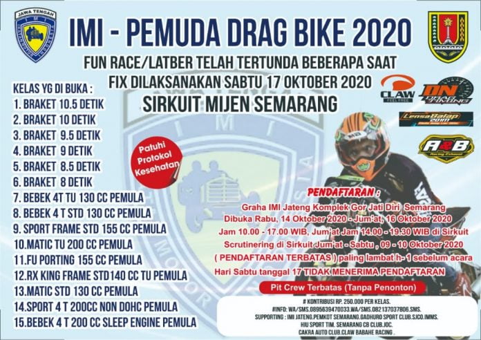 Otomotifzone.com – Tangerang Selatan. Pada tempat yang berbeda dan berselisih hanya beberapa hari saja dengan kegiatan balap drag bike di Central Park Meikarta, Bekasi, Jawa Barat. Di Sirkuit Mijen Semarang, Jawa Tengah tepatnya (17/10/2020) juga akan melaksanakan kegiatan balap drag bike. Namun ini detailnya adalah sebuah latihan bersama.