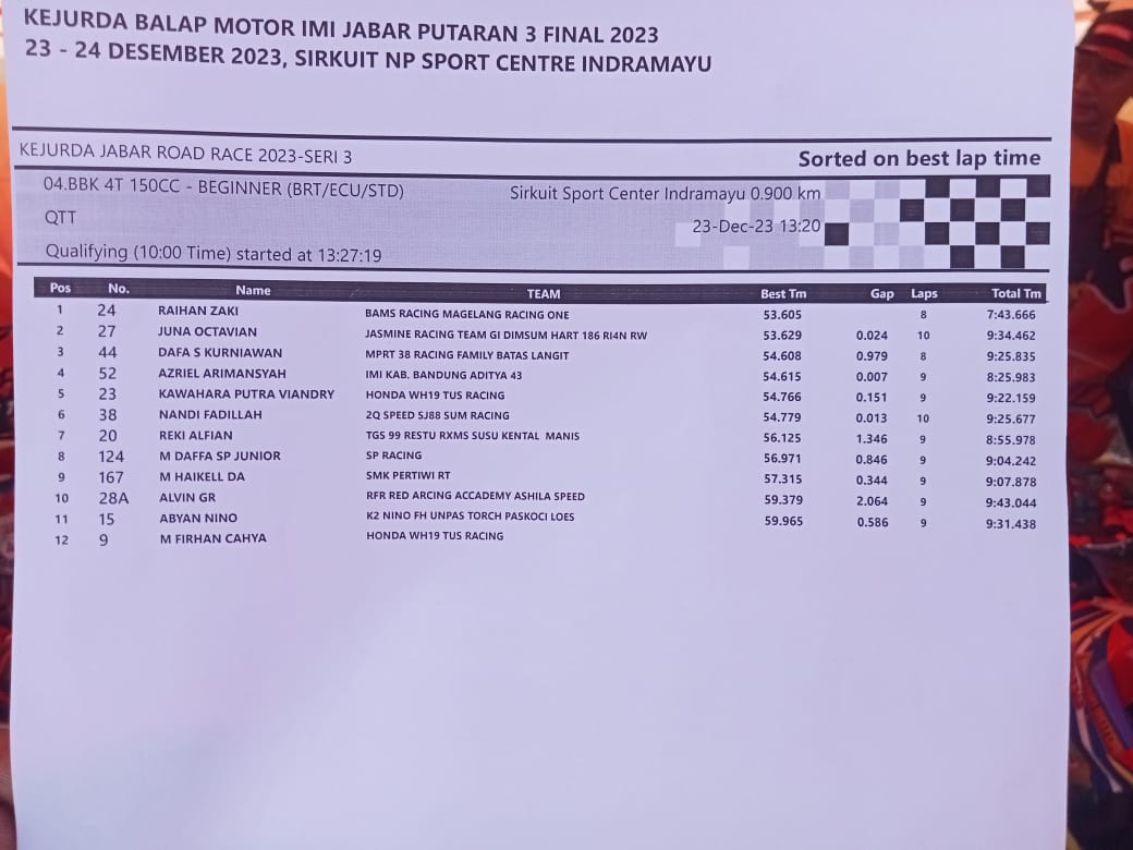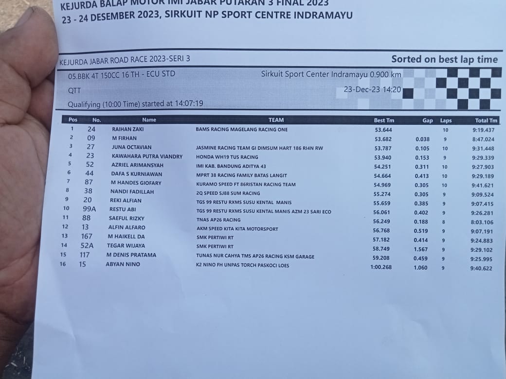 OtomotifZone.com – Indramayu. Sosok pembalap liar dari Magelang ini makin hari makin gacor saja mengendalikan Bebek 4tak 150cc yang berspek Ecu standar. Di kualifikasi Final Kejurda Balap Motor IMI Jabar Di NP Sport Indramayu pada kelas Bebek 4T 150cc Ecu Standar dan Bebek 4T 150cc Beginner Reyhan Zaki berhasil ada di posisi terbaik catatan waktunya.