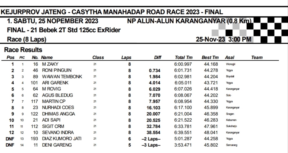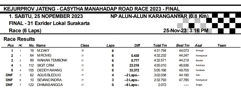 OtomotifZone.com-Karanganyar. Final Casytha Manahadap Road Race sirkuit jl. Lawu, Kota Karanganyar, Jawa Tengah 25 November 2023 beberapa kelas sudah terselesaikan hari ini salah satunya kelas Ex Rider. Dan di kelas ini juga mendapat tambahan kelas Ex Rider lokal Surakarta. Nama M. Zaky dari Team Gajah Putih mencuat setelah hari pertama satu-satunya pembalap yang bisa double winner dan tiga podium.