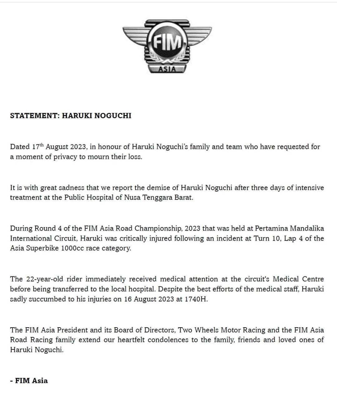 Haruki Noguchi adalah seorang pebalap yang berani dan berdedikasi dalam olahraga yang dicintainya. Meskipun ia telah berjuang dan memberikan segalanya di lintasan, namun takdir berkata lain. Semua upaya medis yang dikerahkan untuk menyelamatkannya tidak berhasil.
