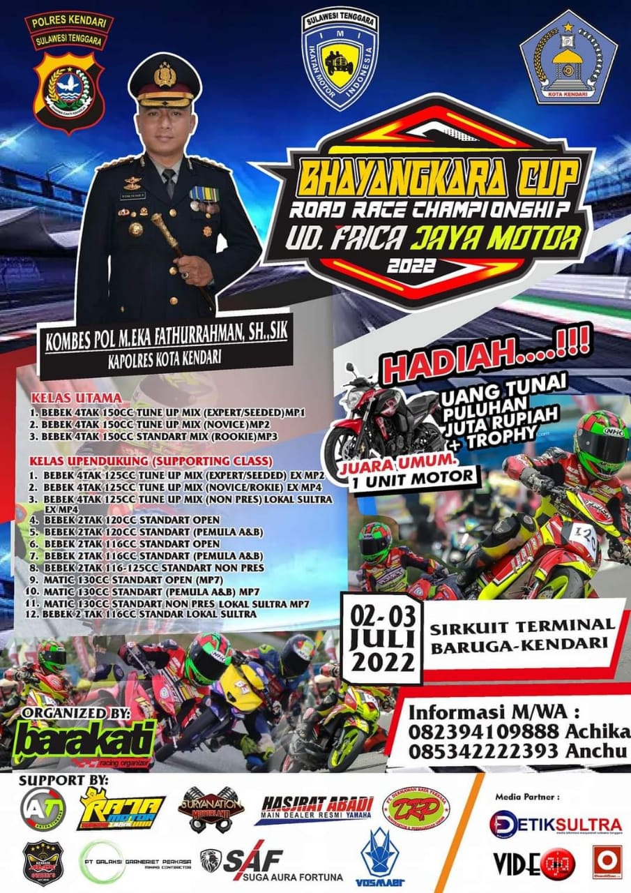 OtomotifZone.com-Bandung. Kembali raungan knalpot racing roda dua akan kembali terdengan dikota Kendari Sulawesi Tenggara minggu ini, tepatnya 2-3 Juli 2022 mendatang, akan digelar Bhayangkara cup Road Race Championship UD Frica jaya Motor digelar di sirkuit non permanen terminal Baruga kota kendari.