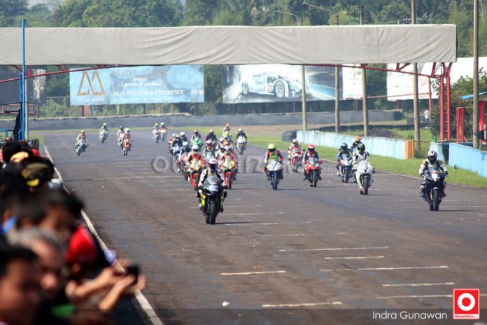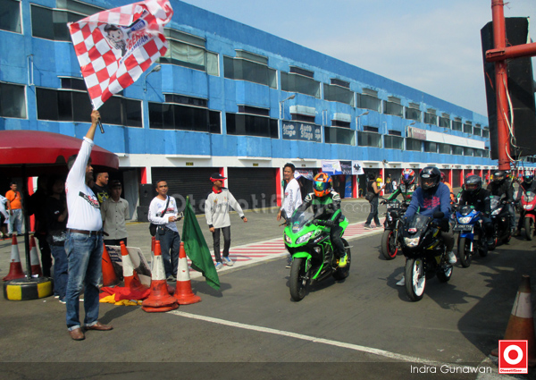 Bukan cuma pembalap. Jelang race 2-Tak 150cc Expert, penyelenggara juga memberikan kesempatan kepada komunitas Kawasaki Ninja untuk melakukan rolling thunder yang dilepas langsung oleh Bambang Asmarabudi dari Indoprom Racing Management dengan mengibarkan bendera start.