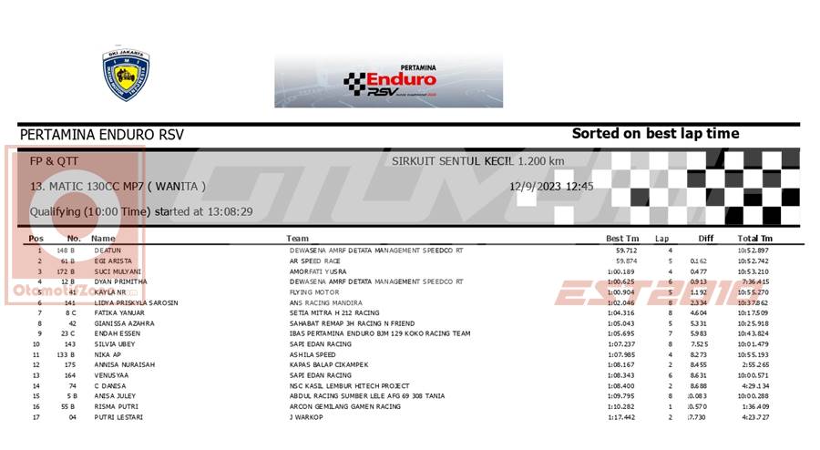 OtomotifZone.com – Sentul. Langsung tancap gas sejak menit awal, Deatun tidak terkejar di Kualifikasi MP7 Wanita di Pertamina Enduro RSV 2023 yang berlangsung (9/12/23) di Sirkuit Internasional Karting Sentul, Bogor, Jawa Barat. Pebalap asal Subang ini mampu menjadi yang tercepat tanpa kawalan. Padahal dirinya jalan sendiri untuk meraih waktu terbaik. Sampai bendera finish dikibarkan, Deatun tidak tergoyahkan.