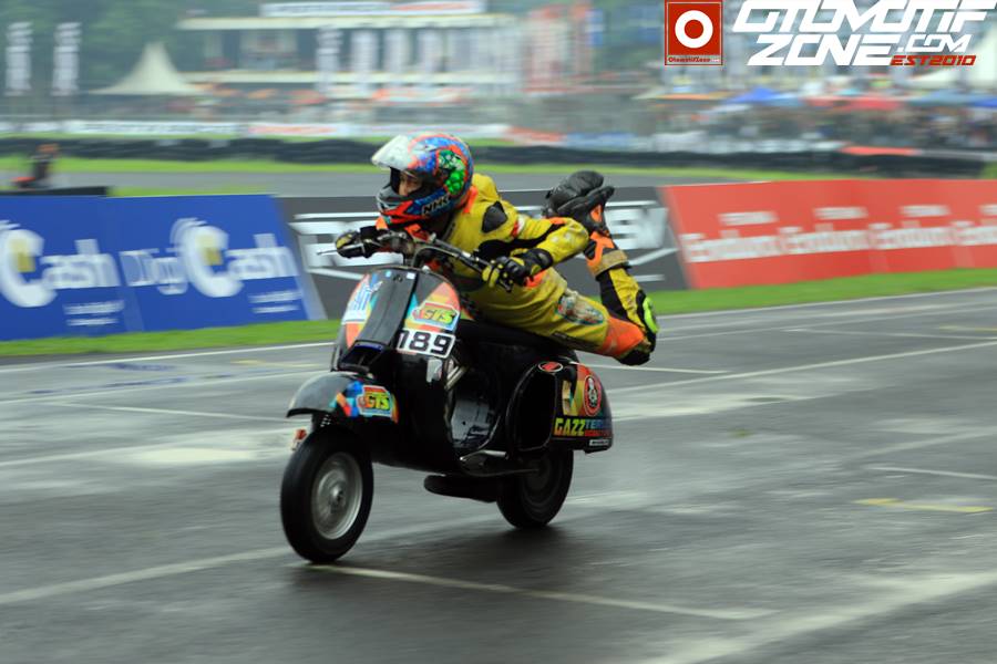 “ Wah susah banget mas balap vespa. Apalagi ini hujan. Saya ubah saja gaya balapnya. Jadi balapnnya saya kaya balap GTX mas biar tidak jatuh dan bisa kedepan,” ujar Muhamad S langsung kepada OtomotifZOne.com