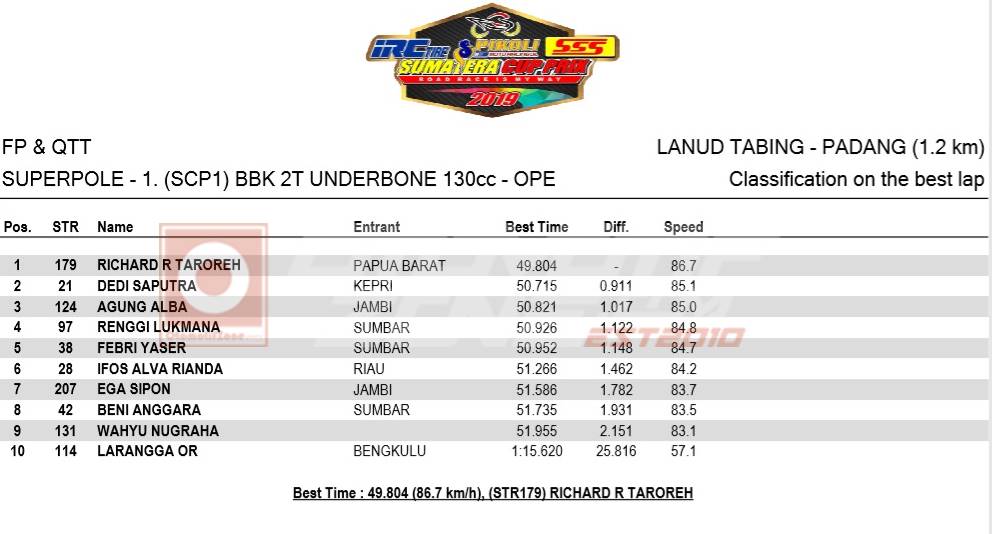Satu persatu pebalap dikeluarkan untuk mendapatkan waktu terbaik superpole. Semakin lama raihan waktu meningkat. Yang mana membuat pebalap sebelumnya dag dig dug rasanya. Dan orang terakhir adalah Richard Taroreh.
