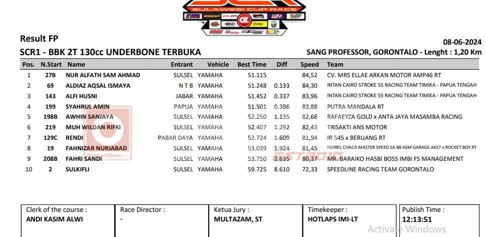 Persaingan sengit sudah terjadi. Alfath mampu menjadi yang tercepat di FP tapi dia harus waspada terhadap peserta lain. Terutama kepada dua pebalap Intan Cairo. Dua pebalap tim asal Papua Tengah ini membuntuti ketat Alfath. Mereka adalah Alfi Husni dan Aldias Aqsal Ismaya.