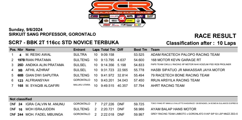 OtomotifZone.com – Gorontalo. Start Yang mulus memudahkan Resky awal rajai SCR7 atau Bebek 2T 116 STD Novice di Sulawesi Cup Race putaran 2 yang berlangsung (9/6/24) di Sirkuit Sang Profesor Gorontalo. Pebalap yang membawa nama bendera Adam Racing ini tinggalkan lawan sangat jauh dibelakang.