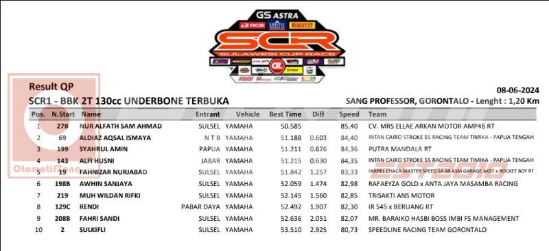 OtomotifZone.com – Gorontalo. Nur Alfath Sam Ahmad masih tanggung di Kualifikasi SCR1 Sulawesi Cup Race Putaran 2 yang berlangsung (8-9/6/24) di Sirkuit Sang Profesor, Gorontalo. Pebalap dari tim CV MRS ELLAE ARKAN MOTOR AMP46 RT masih bertengger kokoh sebagai pebalap tercepat. Tapi waspada, dua pebalap Intan Cairo mengintai.