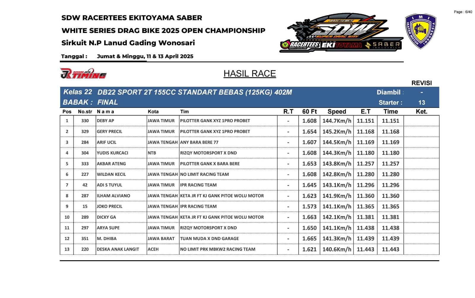 Deby AP sukses mencatatkan waktu tercepat 11.151 detik dan keluar sebagai juara pertama, disusul oleh Gery Percil di posisi kedua dengan selisih tipis hanya 0.007 detik, tepatnya di angka 11.168 detik! Sementara Akbar Atenk, tak pernah kehilangan sentuhannya, berhasil mengamankan posisi kelima.