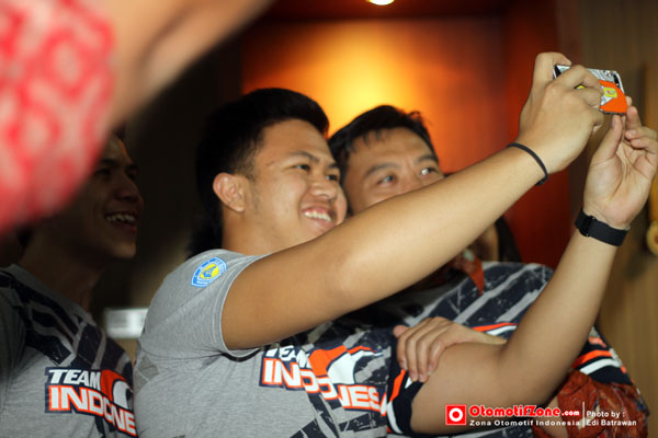 Setelah hampir usai pertemuan Imam Nahrawi bertanya kepada pembalap, ada yang perlu ditanyakan..?? Ketiga pembalap tadi saling sikut dan berharap satu diantara ketiganya mengutarakan hal tersebut, akhirnya kesempatan disambar OZ untuk menyela kalau para pembalap pingin selfie dengan pa menteri. Spontan dan bergegaslah sang menteri ambil HP yang tersimpan dimeja kerjanya dan akhirnya ruang kerja menteri kabinet kerja yang diusung partai PKB ini menjadi ajang selfie……riuh rendahkan ruangan yang nyaman hingga lupa menyantap makanan dan minuman yang sudah disiapkan. nah lhooo……..