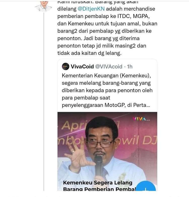 “Kami luruskan. Barang yang akan dilelang Ditjen Keuangan adalah merchandise pemberian Pebalap ke ITDC, MGPA, dan Kemenkeu untuk tujuan amal, bukan barang-barang dari Pebalap yang diberikan ke penonton. Jadi barang yang diterima penonton tetap milik pribadi masing-masing,” jelas Yustinus Prastowo selaku Staf Khusus Menteri Keuangan RI, dalam cuitan twitternya.