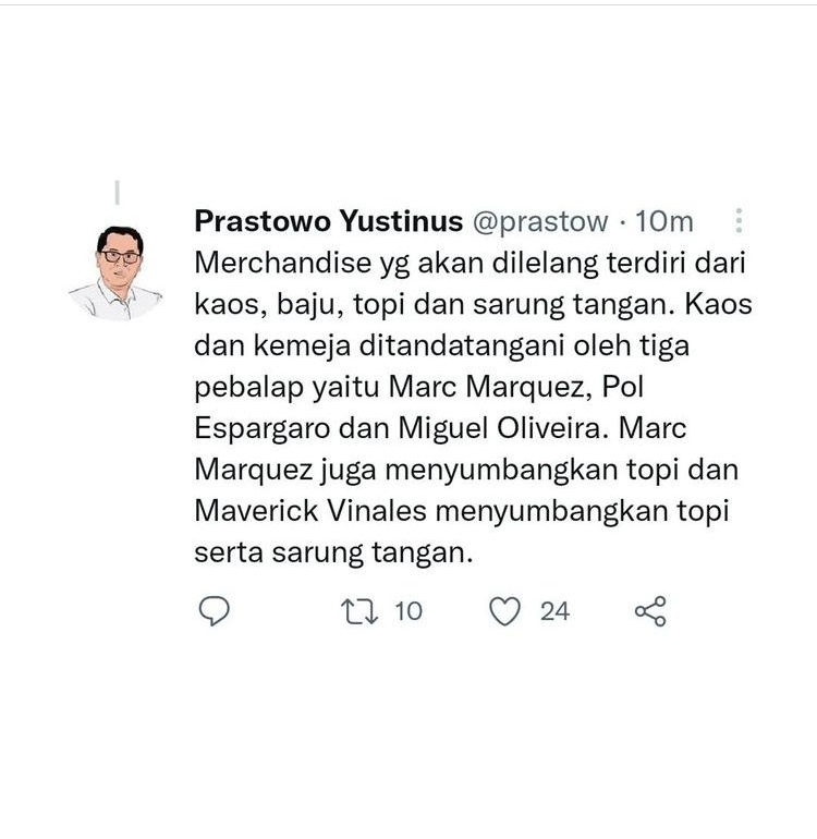 Adapun barang-barangnya menurut Yustinus Prastowo ialah, kaos, baju, topi, dan sarung tangan. Kaos dan kemeja dengan tanda tangan 3 Pebalap, Marcquez, Pol Espargaro, dan Miguel Oliveira. Marc juga akan memberika topi, serta Vinales sarung tangannya.