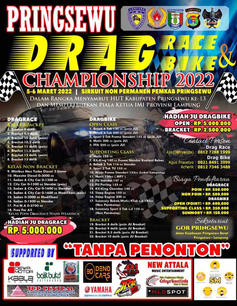Otomotifzone.com – LAMPUNG. Pringsewu sedikit lagi akan ada 2 balapan besar. Berlokasi di Sirkuit Non Permanen PEMKAB Pringsewu – Lampung, tepatnya (26-27/3/2022). Event balap lurusan, akan terlaksana. Pihak panitia mengadakan balapan, dalam rangka menyambut HUT Kabupaten Pringsewu ke-13 Tahun.