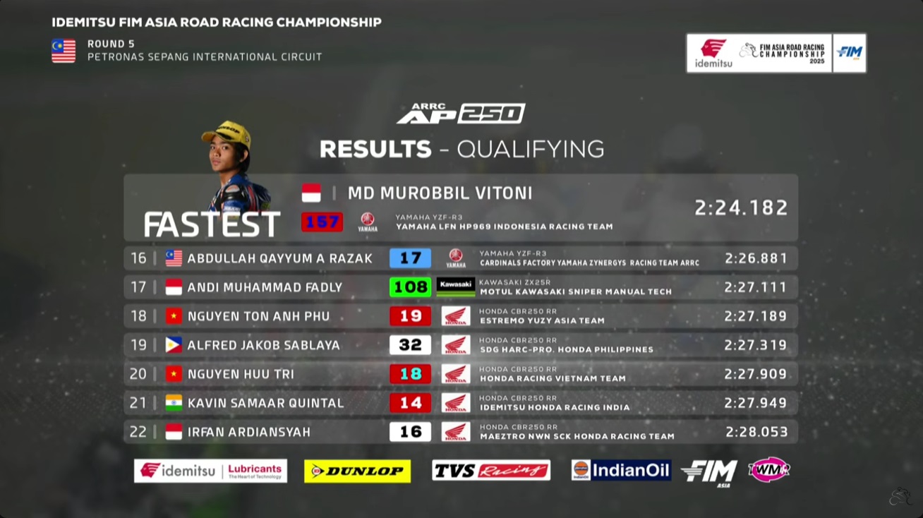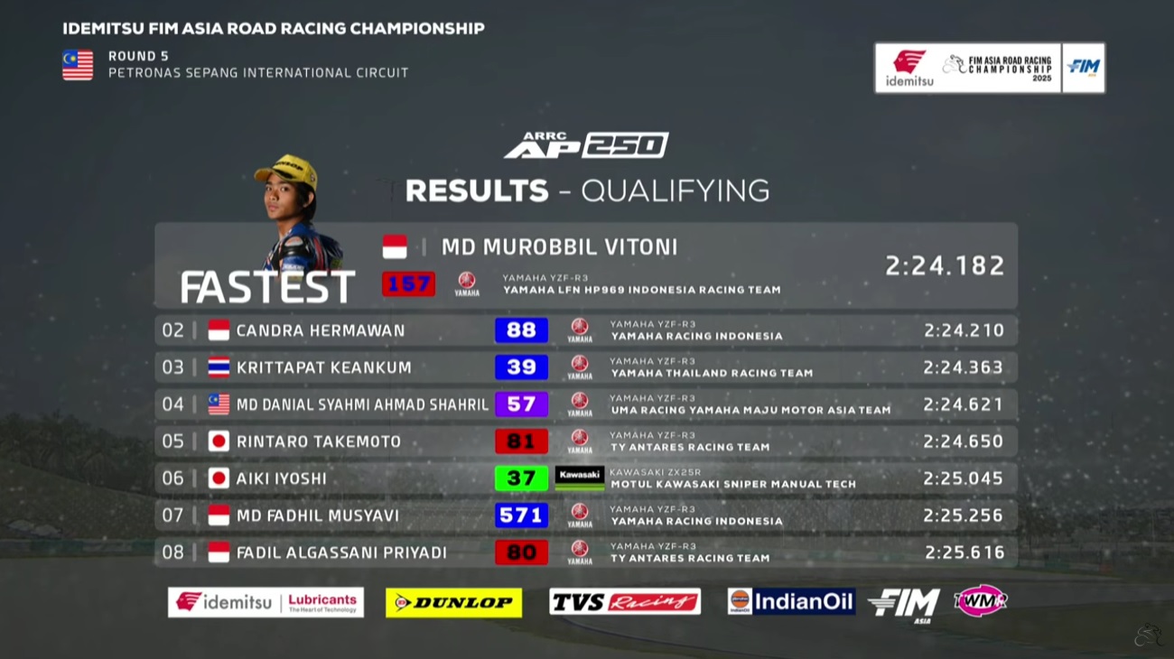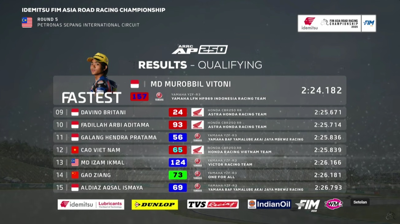 OtomotifZone.com – Malaysia. Pembalap Yamaha LFN HP969 ini start terdepan kembali di putaran kelima Asia Road Racing Championship sirkuit Sepang, Malaysia 10-12 Oktober 2025. Sebelumnya di Mandalika Robbi juga start di grid pertama pada kelas yang pertama kali ia ikuti ini. Fokus utama tetap mengejar point masuk pertempurab tiga besar Klasemen Sementara AP250 jelang seri terakhir nanti.