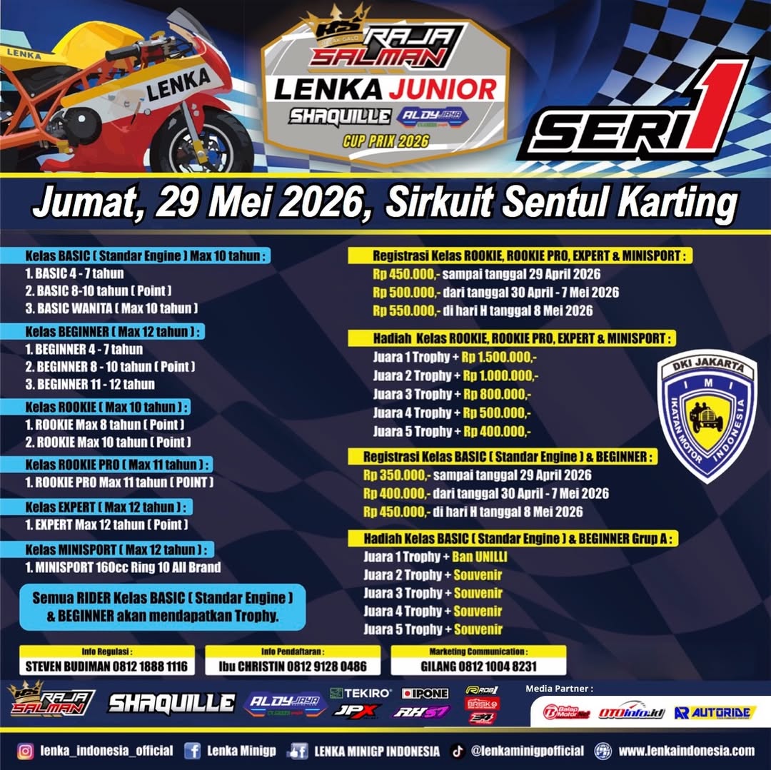 OtomotifZone.com – Jakarta, Ajang balap pembinaan usia dini kembali hadir. Raja Salman Lenka Junior Cup Prix 2026 Seri 1 dijadwalkan berlangsung pada Jumat, 29 Mei 2026 di Sirkuit Sentul Karting. Event ini diprediksi akan menjadi salah satu ajang bergengsi bagi pembalap muda Indonesia dalam menunjukkan bakat dan kemampuan mereka di lintasan.