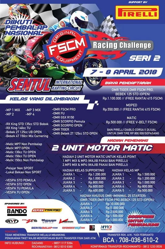 “Persaingan antar pembalap akan terjadi dengan sangat sengit, mengingat kejuaraan ini merupakan salah satu target team-team balap sebagai tolak ukur untuk mengikuti kejuaraan yang bersifat Nasional”, papar Rifan Armando, Marketing Section PT. FSCM Manufacturing Indonesia.