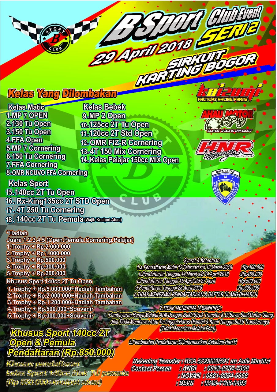 Otomotifzone.com – Jakarta. Akhir pekan ini seri 2 B Sport akan di gelar akhir pekan ini (29/4) di Sirkuit Internasional Karting Sentul, Bogor. Pada gelaran seri 2 ini Andi Tatto selaku penyelenggara mengusung tema berbeda dari seri pertama. Beberapa kelas Kejurnas tidak dibuka oleh Kejurnas.