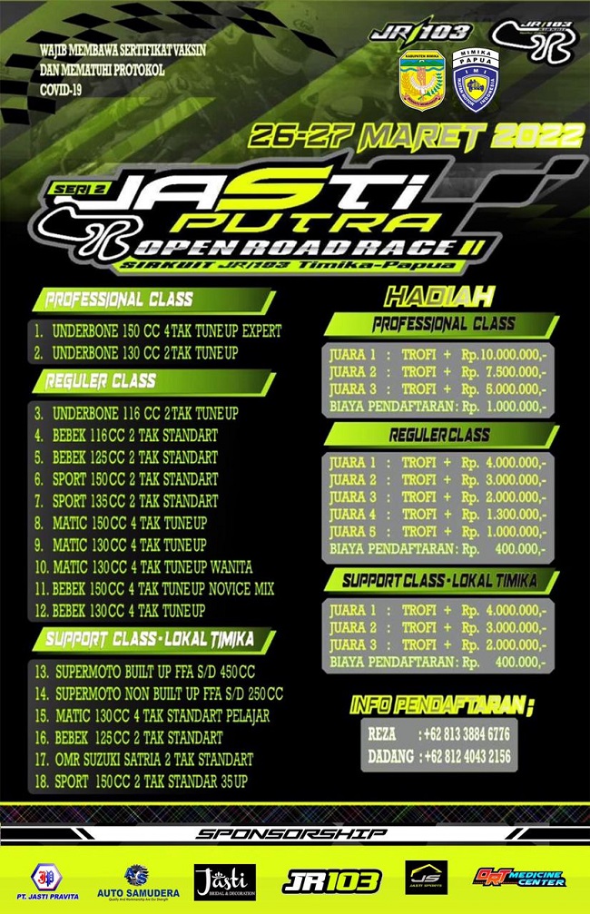 OtomotifZone.com – Timika. Para pecinta balap motor di Papua. Pasti kalian sudah tidak sabar untuk turun kembali di ajang balap. Kali ini akan ada event besar yang diselenggarakan (26-27/3/22) di Sirkuit JR 103, Timika, Papua. Seri 2 Jasti Putra Open Road Race 2022 menjadi tema dalam event ini. Tidak tanggung tanggung, 18 kelas akan dilombakan.