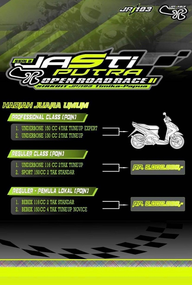 Timika Istimewa….Kenapa penulis menyebut bahwa Timika Istimewa? Karena event ini akan menjalankan kelas-kelas bergengsi dengan Hadiah juara yang menarik, untuk Juara umum Kategori Professional Class dihadiakan satu unit motor dengan syarat total poin 2 kelas yang dilombakan, Pada Juara umum Reguler Class pembalap cukup mengumpulkan point dari kelas Underbone 116cc 2Tak Tune up dan Sport 150cc 2Tak Standart serta akan diamplopin Lima juta Rupiah, untuk pemenang Support Class-Lokal Timika penyelenggara akan memberikan Lima juta Rupiah dengan memenangkan Bebek 116cc 2Tak Standart dan Bebek 150cc 4Tak Tune Up Novice.