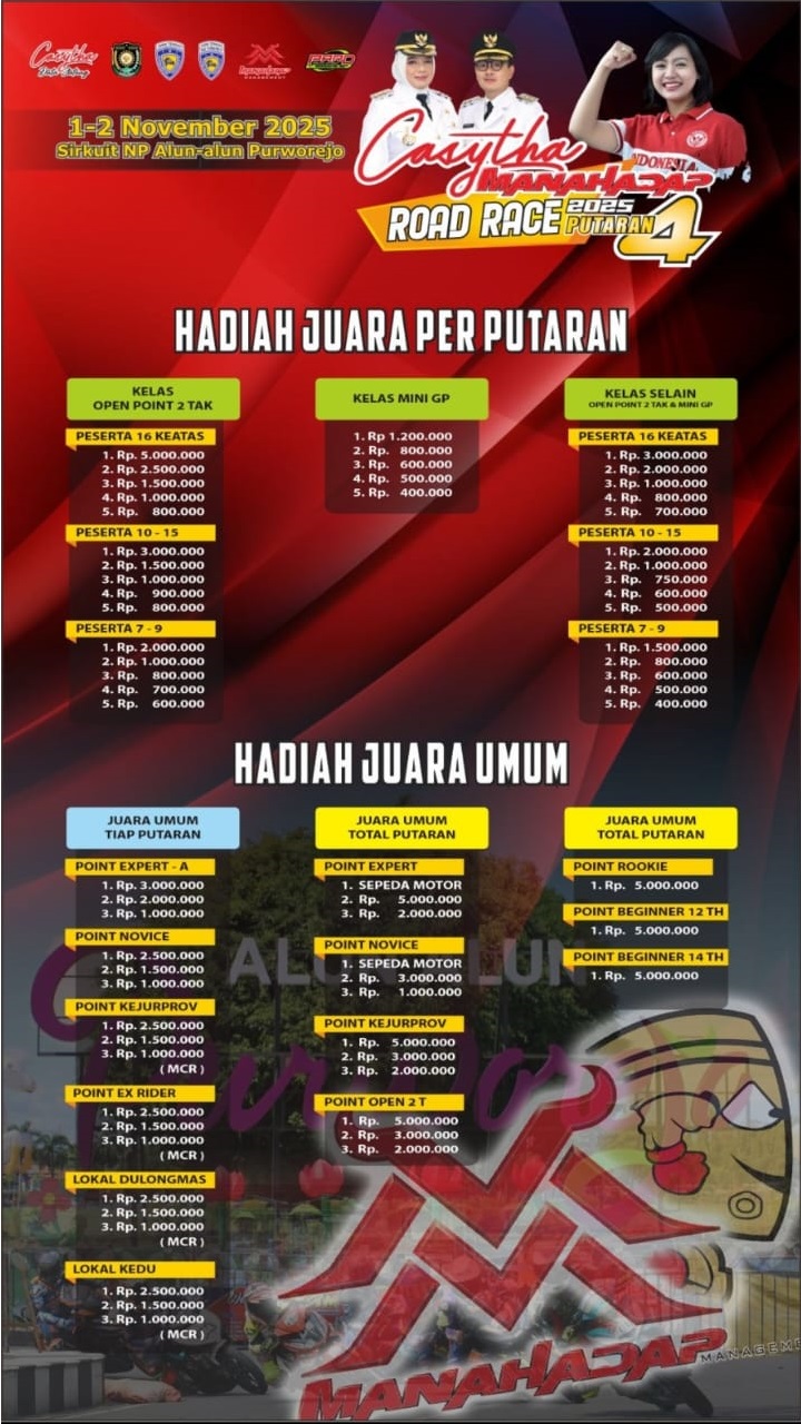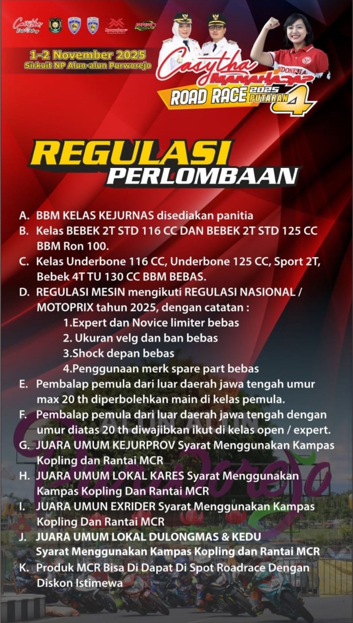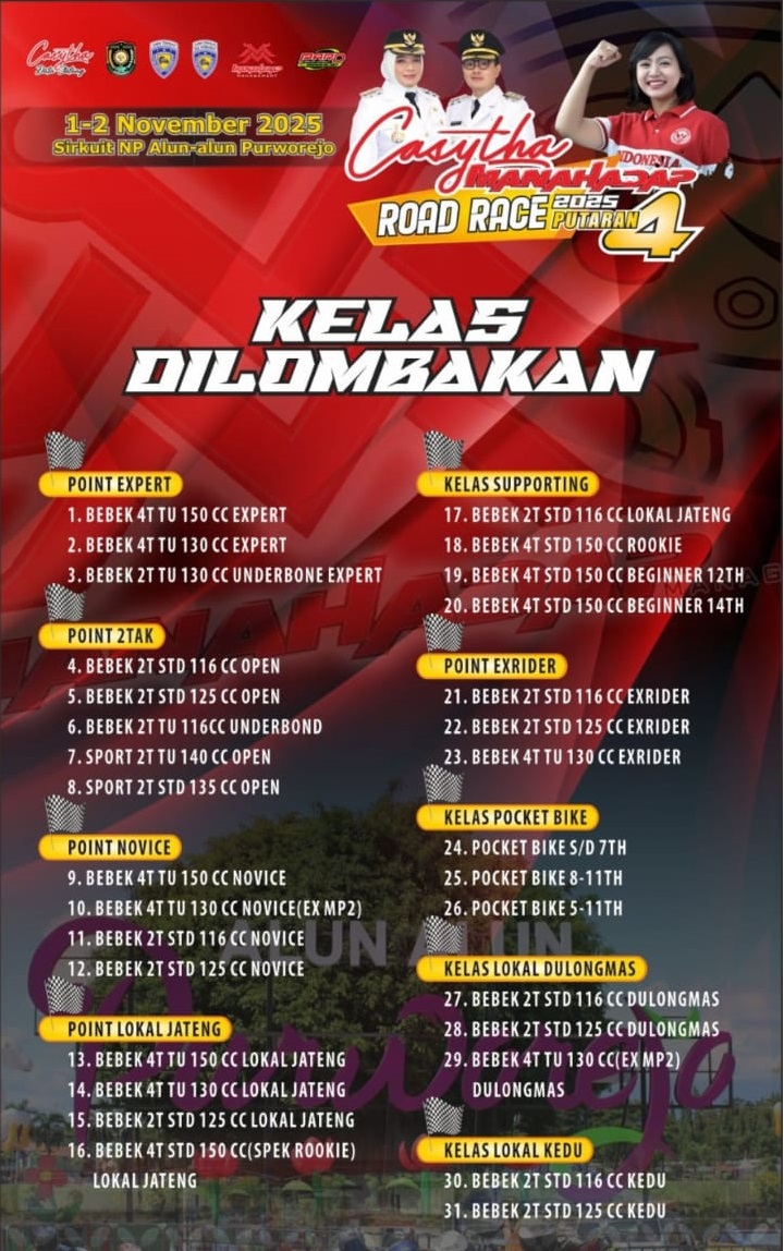 31 kelas siap mewarnai seri keempat ini lintasan non permanen alun-alun kota Purworejo. Layout yang mungkin jarang ditemui setelah 3 hari berjalan menjadi titik penasaran rider rider yang akan hadir di seri 4 Kasita mana hadap road race Championship pekan depan. Informasi yang lebih detail ada pada pamflet di bawah ini karena salah satu sponsor mereka yakni MCR racing part menjadi salah satu syarat wajib point juara seri.