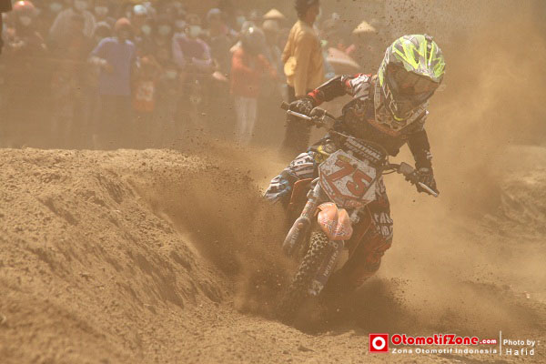 Tahukan Motocross luar negeri model tracknya seperti apa? Tanah gembur bagaikan pasir yang bisa menjerembabkan motor kalau gak sanggup mengendalikan liarnya pacuan. Plus motor yang kurang cepat bisa selip roda belakang menggerus gemburnya tanah sirkuit Kledung.“Saya sempat bilang sama Irwan Ardiansyah, bagus gak sirkuitnya? Dia menjawab ini sirkuit mirip MX1, model-model disana ya seperti ini.” kata mister Arif MBG yang disini sebagai juri. “Ada tapinya, bagus untuk motor-motor 85cc keatas. Untuk 50cc dan 65cc agak berat,” tambah bapak ramah yang konon kalau marah tambah ganteng. Hehehe… Beda dengan sirkuit di Bali, walaupun disana pasir tapi tipenya padat, ibaratnya pasir basah.