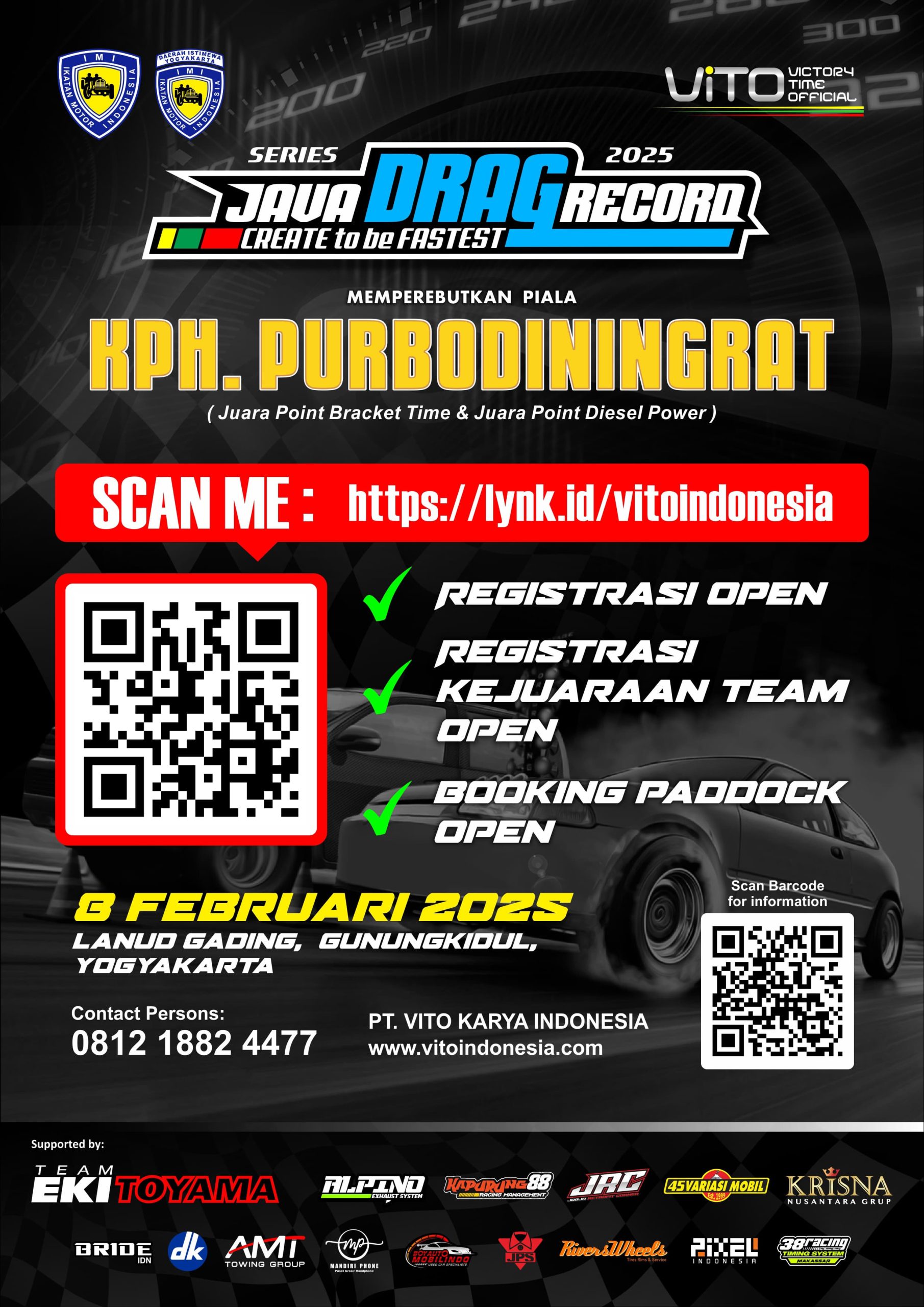 Bagi para peserta yang akan melakukan registrasi dan booking paddock bisa langsung scan QR Code atau hubungi CP yang tertera pada pamflate yang sudah disiapkan oleh panitia Java Drag Record Series 2025 piala KPH. Purbodiningrat.