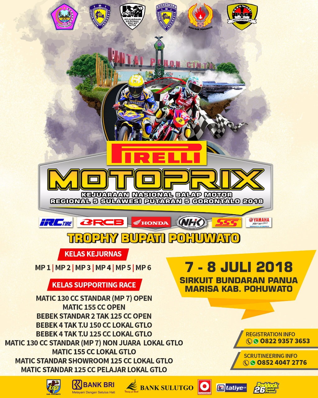 Event yang memperbutkan Thropy Bupati Pohuwato serta total hadiah hingga 95 juta rupiah ini bakal menggelar 9 kelas selain kelas 6 Wajib Kejurnas Motoprix 2018.