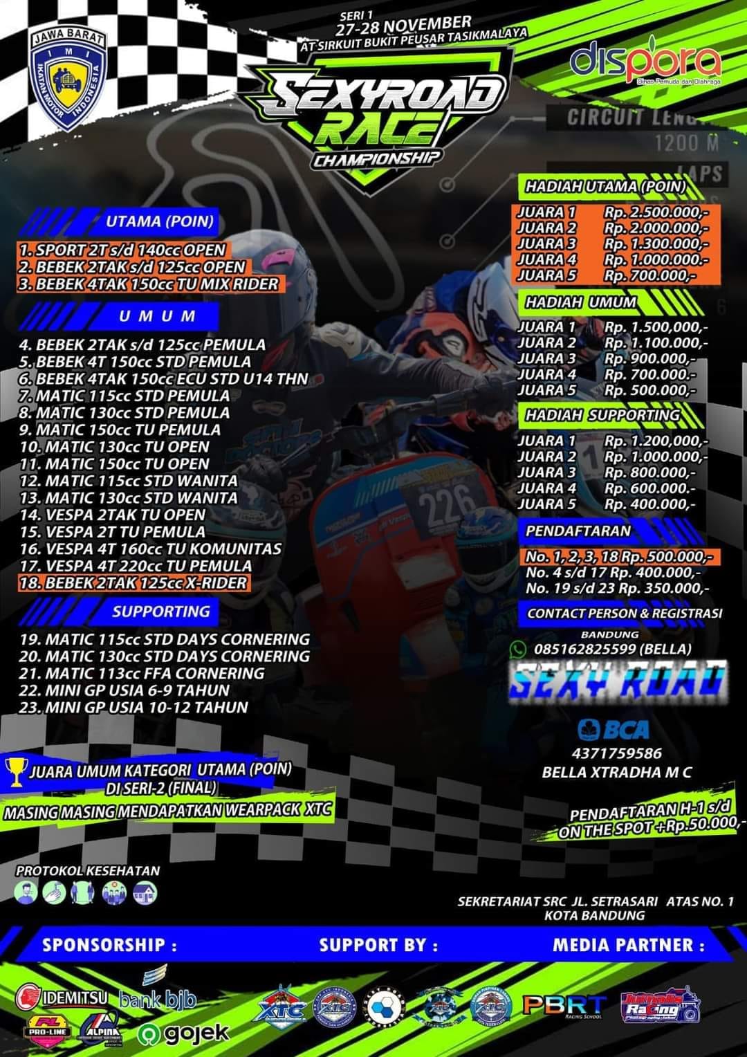 Event Sexy Road Race ini akan menjalankan 23 kelas yang dilombakan. Dari 23 kelas yang nantinya akan dilombakan terbagi menjadi tiga katagori. Pertama ada katagori point yang mana ada tiga kelas yang dilombakan. Lalu ada katagori Umum yang akan memperlombakan 15 kelas. Dan terakhir ada katagori Supporting Class yang akan memperlombakan lima kelas.