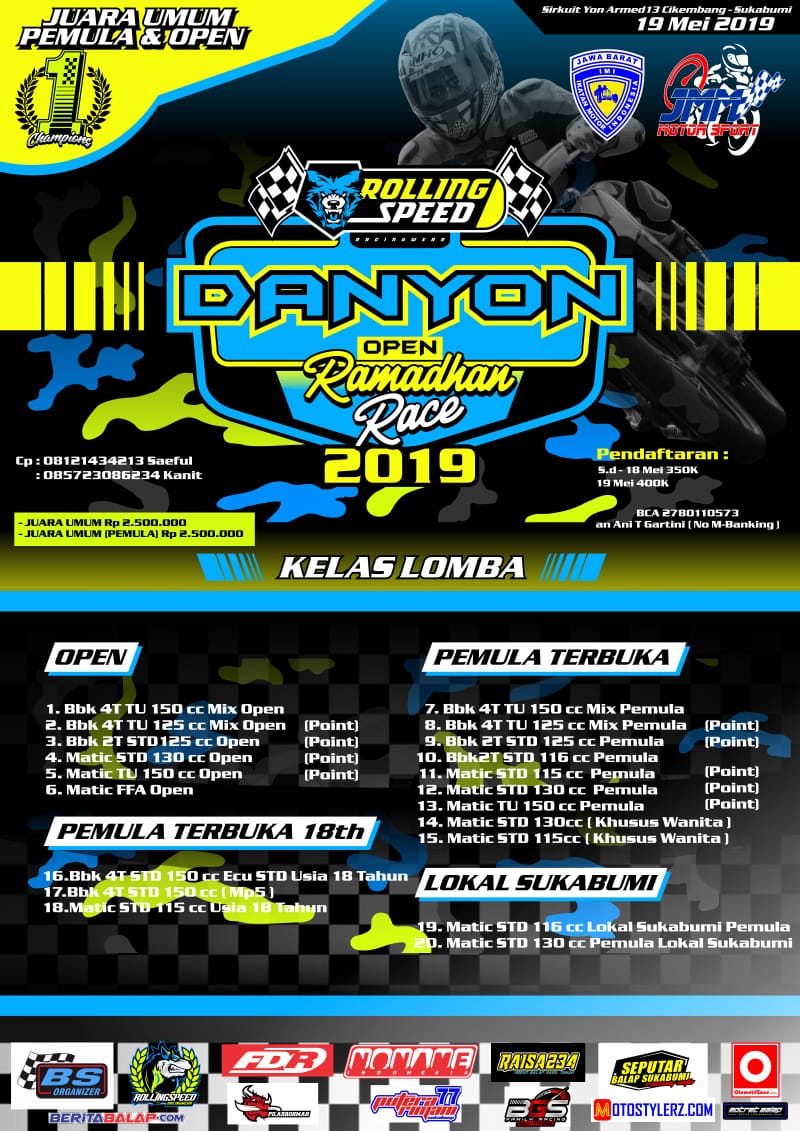 Yuk buat temen-temen yang racing lovers yang ada di Jawa Barat khususnya di daerah Sukabumi kita datang dan saksikan langsung aksi dari para pembalap-pembalap top Jawa Barat yang akan berlaga di event Rollingspeed Danyon Open Ramadhan Race Championship 2019 yang akan di langsungkan di sirkuit Yon Armed 13 Cikembang Sukabumi akhir pekan ini.