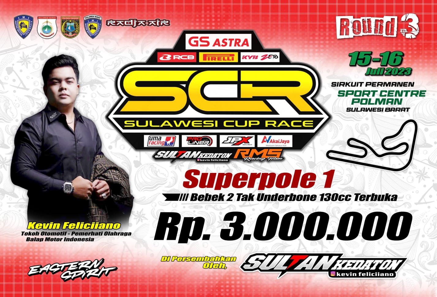 Lalu pada putaran kedua dirinya memberi hadiah tambahan yang diumumkan dari jauh jauh hari. Pebalap terbaik di sesi Superpole mendapatkan hadiah tambahan dari Sultan Kedaton. ” Kita tidak mau mengurangi kualitas event kita. Tetap kualitas event yang kita terapkan. Ini semua untuk memanjakan para peserta datang. Selain itu Kevin dari Sultan Kedaton juga memberikan hadiah tambahan di Superpole dan beberapa kelas lain,” ujar Medya Saputra selaku penyelenggara SCR.