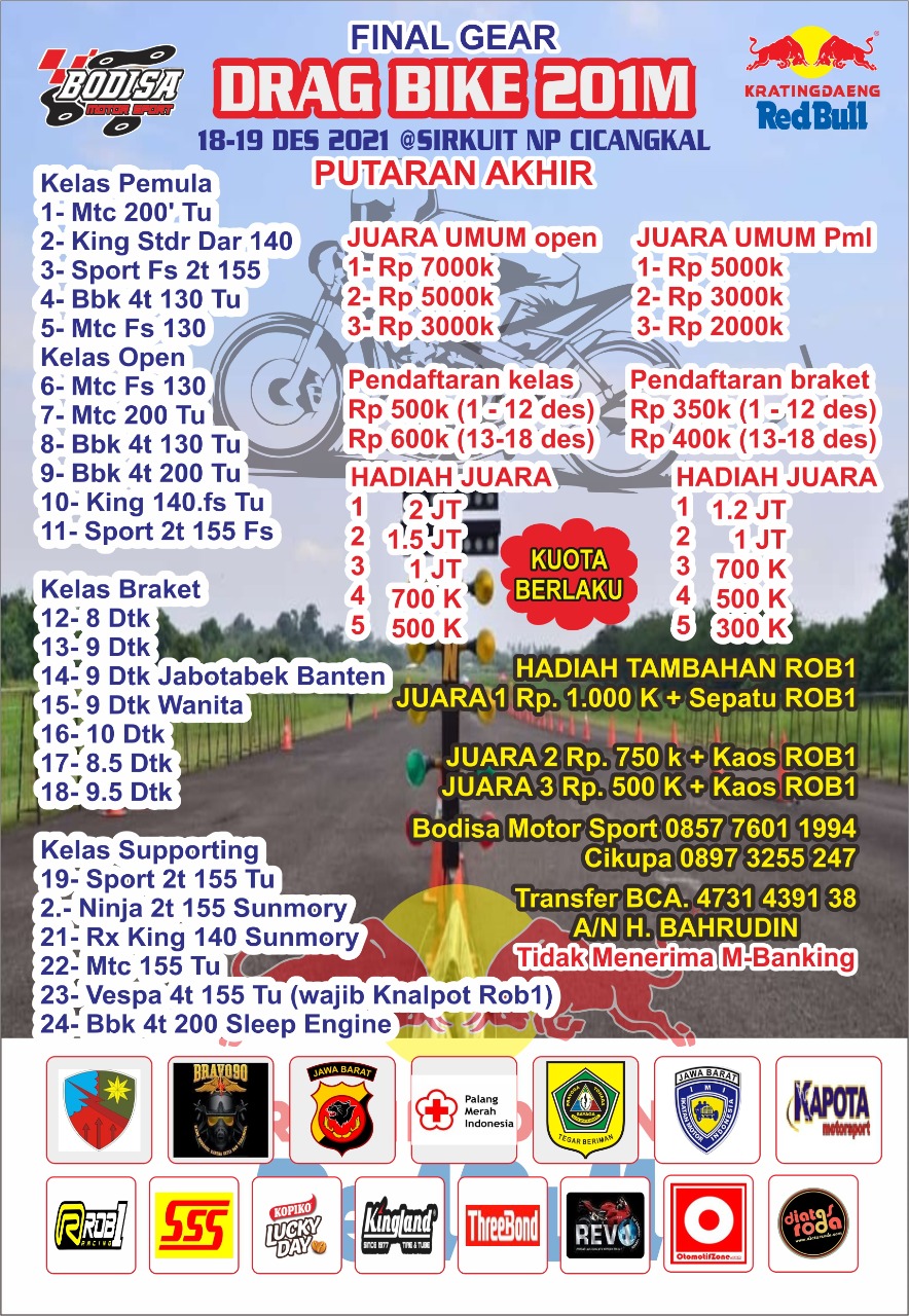 Otomotifzone.com – Tangerang Selatan. Ajang final dari drag bike 201 meter Bodisa Motor Sport, yang akan terselenggara akhir pekan nanti (18-19/12/2021) di Sirkuit Non Permanen TNI-AU Cicangkal, Rumpin, Bogor – Jawa Barat. Memiliki evaluasi perubahan dalam segi kelas yang dijalankan nantinya. Beberapa kelas baru akan menghiasi jalannya balapan, dan beberapa kelas akan terhapus.