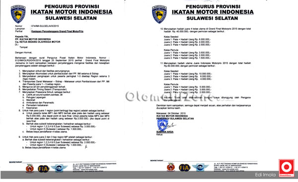 Naaaaah….ini baru cerita seru brader semuanya….PP IMI akhirnya mengerti dan mendengar keluhan para pelaku balap road race tanah air, mungkin kerinduan ini sudah dipendam selama 10 tahun dan hanya melahirkna para jagoan tanpa gelar nasional Sejati. Minggu depan, tepatnya 16-18 Oktober 2015, Pengprov IMI Sulsel menjadi pengprov tersibuk, dimana pasukan dibawah Subhan Aksa ini harus berjuang keras bagaimana hajatan besar ini sukses, baik sisi penyelenggaraan, memaintenance para pembalap dan team dan juga menjadi bukti sejarah pertama kalinya lahir kembali sang juara sejati juara MotorPrix Indonesia 2015.