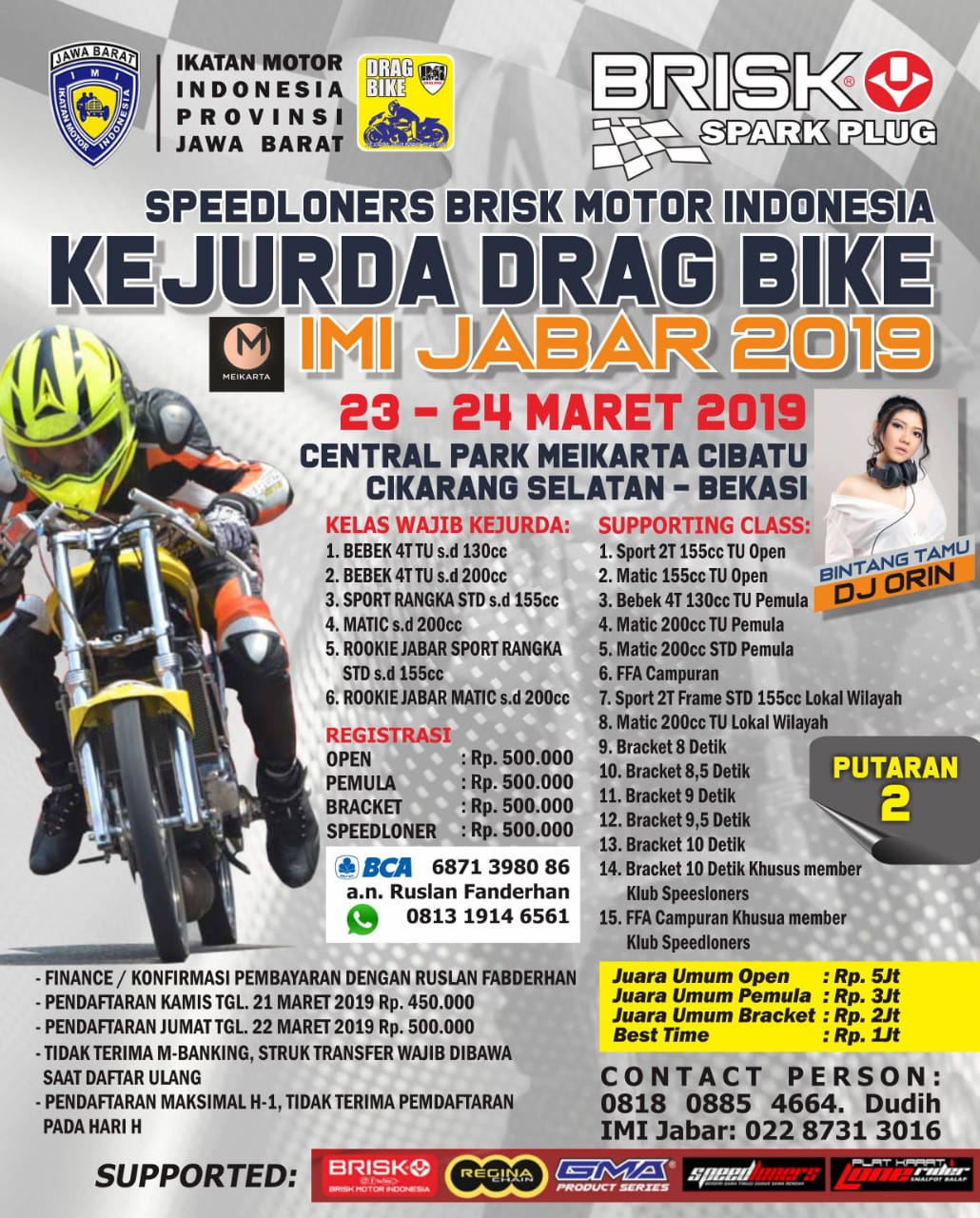 ” Tahun ini Brisk Busi Motor Indonesia tahun ini memiliki rencana bakal menggelar event drag bike dalam tiga seri di Meikarta, namun adanya tawaran untuk menyelenggarakan event Kejurda Drag Bike IMI Jabar 2019 Seri 2 sehingga kita menyanggupinya dan digelar secara bersama” Buka Ruslan Fanderhan selaku ketua penyelenggara