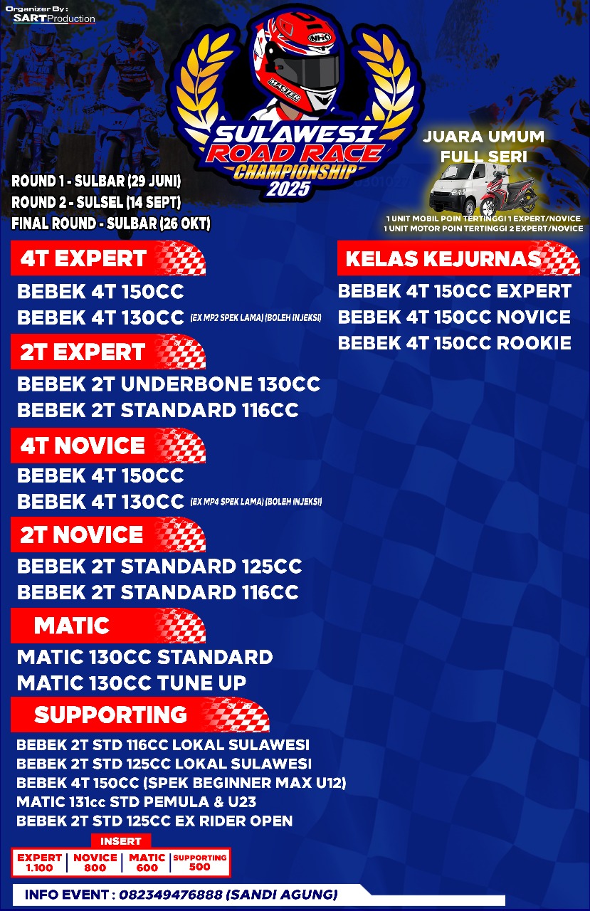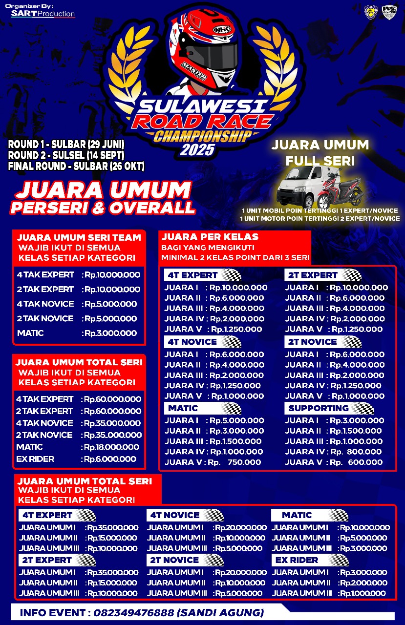 OtomotifZone.com – Polman. Sulawesi Road Race Championship kembali lagi di 2025. Hadiah yang akan diberikan lebih menyala dari tahun lalu. Dan gelaran garapan Sandy Agung ini akan dihelat selama tiga putaran dan akan sampai Sulawesi Selatan.
