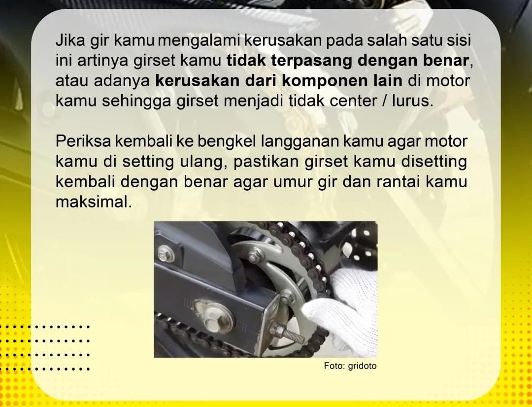 “ Jadi pemasangan gear dan rantai pada motor itu tidak sembarangan. Jadi kita harus center mas pasangnya. Kalau tidak center bisa bisa merusakan komponen gear ataupun rantai. Ini yang membuat gear set tidak awet,” ujar SSS pada akun resminya.