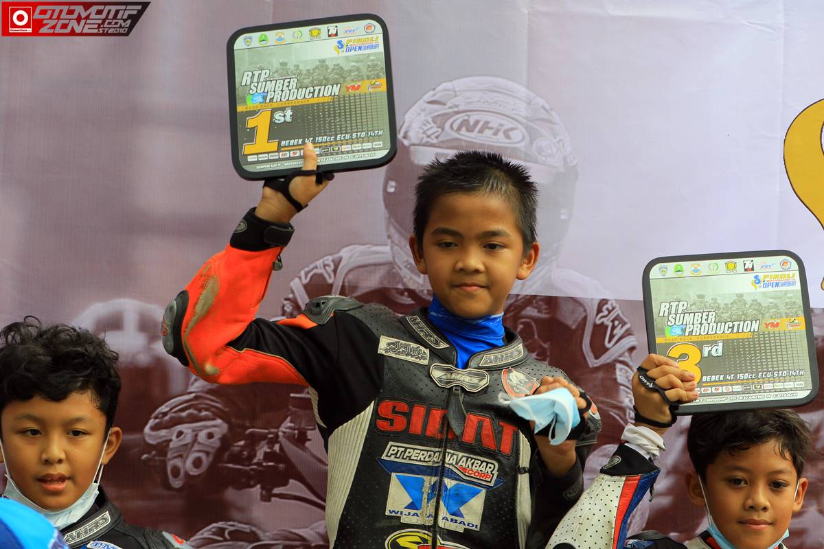 OtomotifZone.com – Bandung. Hampir hampir saja Rivan Aldi kehilangan title juara pertamanya di kelas ECU STD RTP Sumber Production Championship 2021 (6/11/21) di Sirkuit Brigif Kujang II Cimahi, Bandung, Jawa Barat. Akhir akhir lap menegangkan karena jarak lawan mendekat. Namun Dewi Fortuna masih berpihak kepada pebalap cilik dari tim38 Racing Team AB139 Racing Academy. Rivan mampu sentuh garis finish di posisi pertama.