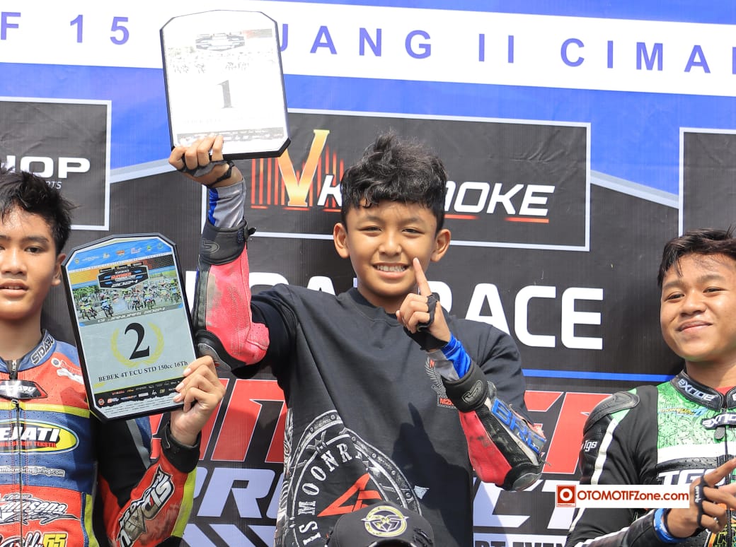 OtomotifZone.com-Bandung. Mental juara memang dimiliki pelajar SMPN 5 klas 7K kota Bandung, Juna Octavian, meski masih belum pulih dari demam akibat cuaca dan intensitas kegiatan yang begitu banyak, pembalap nomer start 27 tetap menjadi juara.