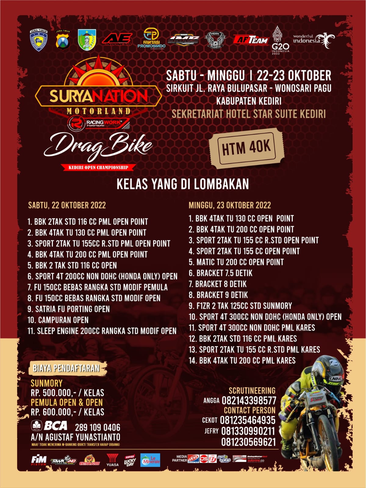 OtomotifZone.com – Kediri. Hello warga Kediri, apakah kalian tau kalau daerah kalian akan menjadi saksi gelaran bergengsi (22-23/10/22) di Sirkuit NP Bulupasar, Wonosari Pagu, Kab Kediri. Suryanation Drag Bike garapan AE Indonesia akan diselenggarakan secara meriah. Terlebih mereka mengkonsepkan event ini dengan rapih dan meriah.