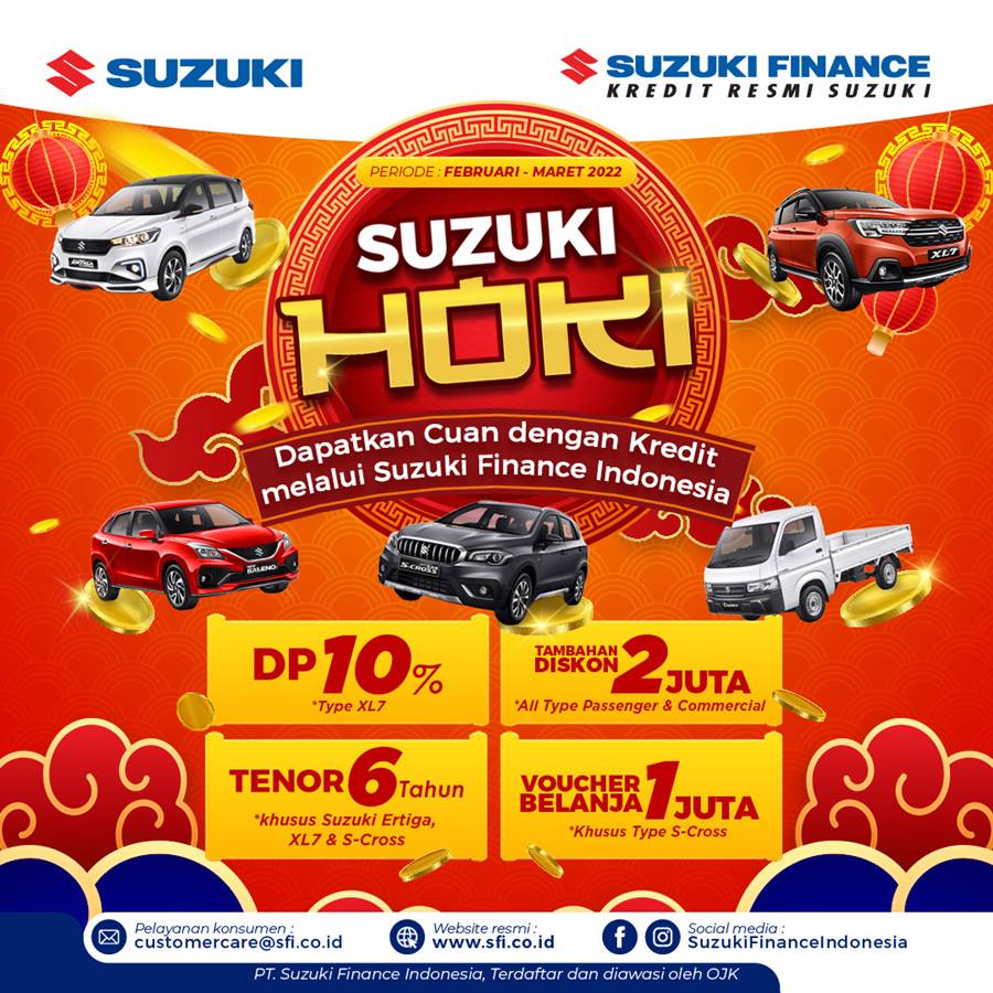 OtomotifZone.com Jakarta – PT Suzuki Finance Indonesia (SFI) kembali menghadirkan promo menarik sebagai bentuk apresiasi kepada pelanggan setia Suzuki dan dalam rangka merayakan Hari Raya Imlek. Kali ini SFI menghadirkan promo “Suzuki Hoki” yang berlangsung dari 1 Februari 2022 sampai 31 Maret 2022 dan dapat dinikmati oleh pelanggan Suzuki yang ada di seluruh Indonesia.