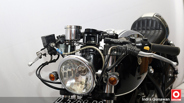 “Setang aplikasi model jepit dengan headlamp membulat model klasik. Sedangkan Kelir seluruh motor sengaja dipilih warna hitam dengan perpaduan garis silver ditengahnya,” tutup Kang Mpur yang menjuluki motor ini Psycobilly cafe racer.