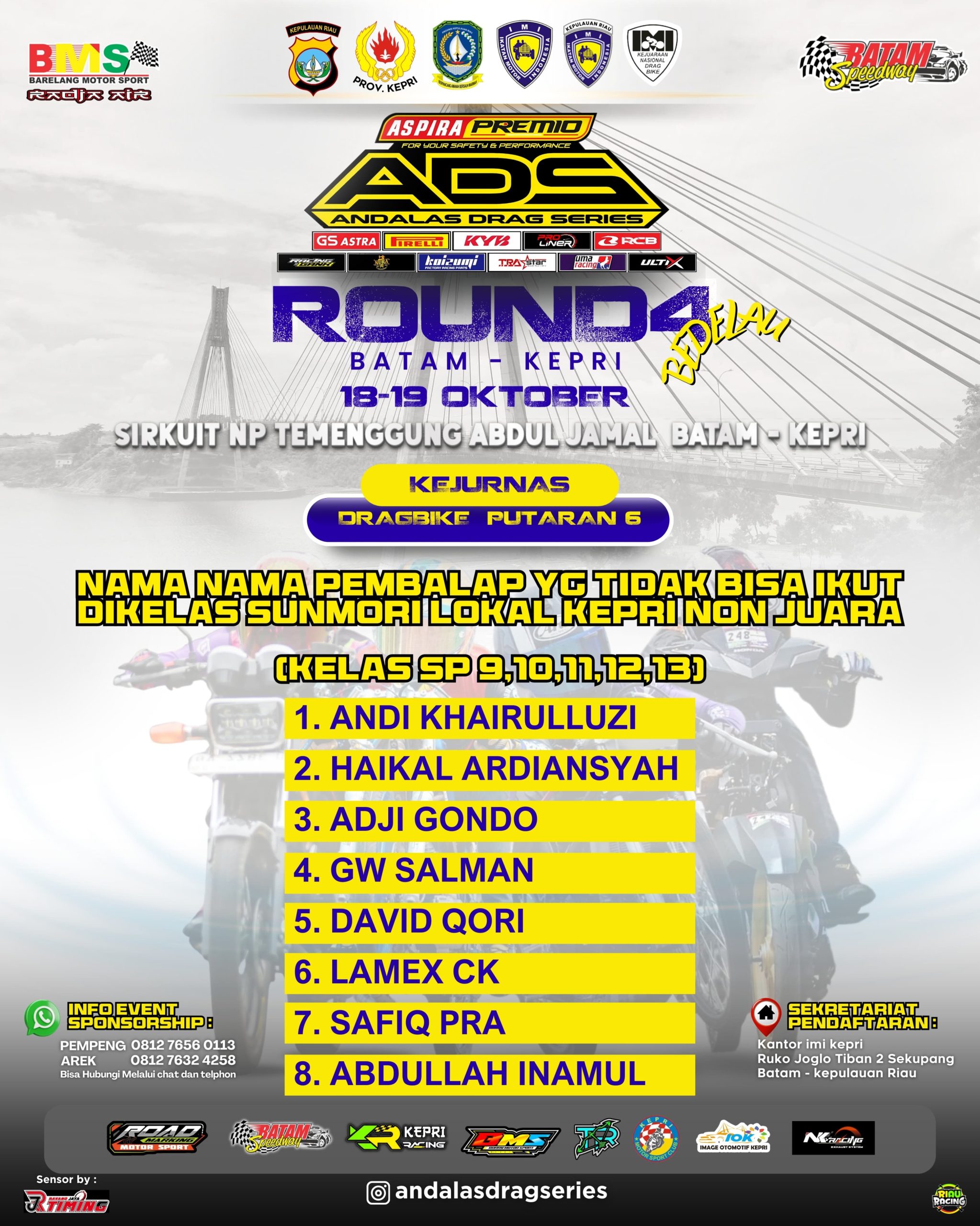 OtomotifZone.com – Batam, Peringatan keras dikeluarkan menjelang gelaran Andalas Drag Series 2025 Seri 4 yang akan digelar pada 18-19 Oktober 2025 di Sirkuit NP Temenggung Abdul Jamal, Batam. Pihak penyelenggara secara resmi melarang sejumlah pebalap untuk ikut serta di kelas Sunmori Lokal Kepri Non Juara.
