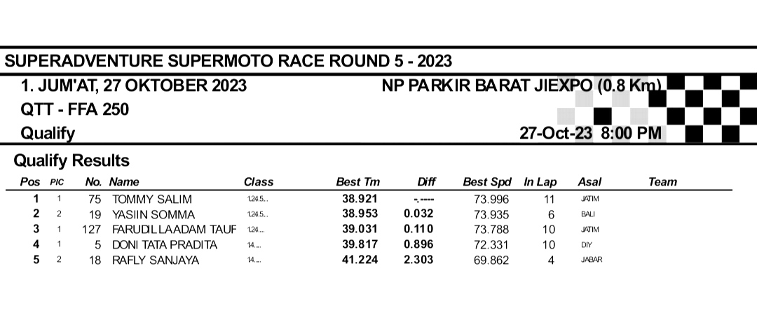 OtomotifZone.com-Jakarta. Sesi kualifikasi pada kelas FFA 250 sudah terlaksana semalam. Pertempuran kelas ini terfokus pada pertarungan antara Farudila Adam dan Tommy Salim. Di kualifikasi semalam kelas FFA 250 Tommy membuat sebuah tekanan kepada Adam karena dia berhasil sebagai yang tercepat di kualifikasi.