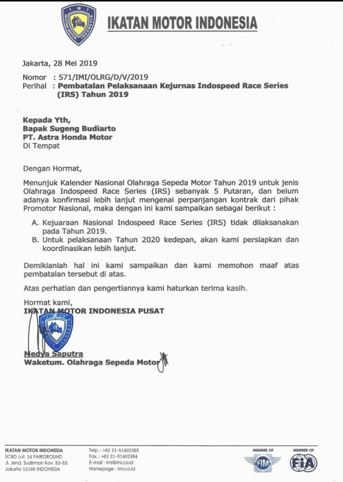 Dalam surat disebutkan bila mana event motor sport skala Nasional 2019 tidak diadakan tapi akan dipersiapkan untuk tahun 2020. Dan Medya juga sengaja mengumumkan dibatalkannya event tersebut.