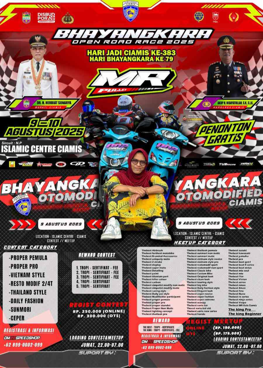 OtomotifZone.Com – Ciamis. Tiket gratis untuk penonton di event Bhayangkara Mr Pulley Open Roadrace 2025 Ciamis Jawa Barat. Gelaran berlangsung di sirkuit dadakan Islamic Centre atau Gedung K.H. Irfan Hielmy pada Sabtu-Minggu (9-10/08/2025).