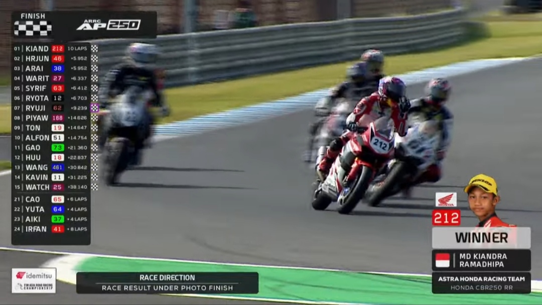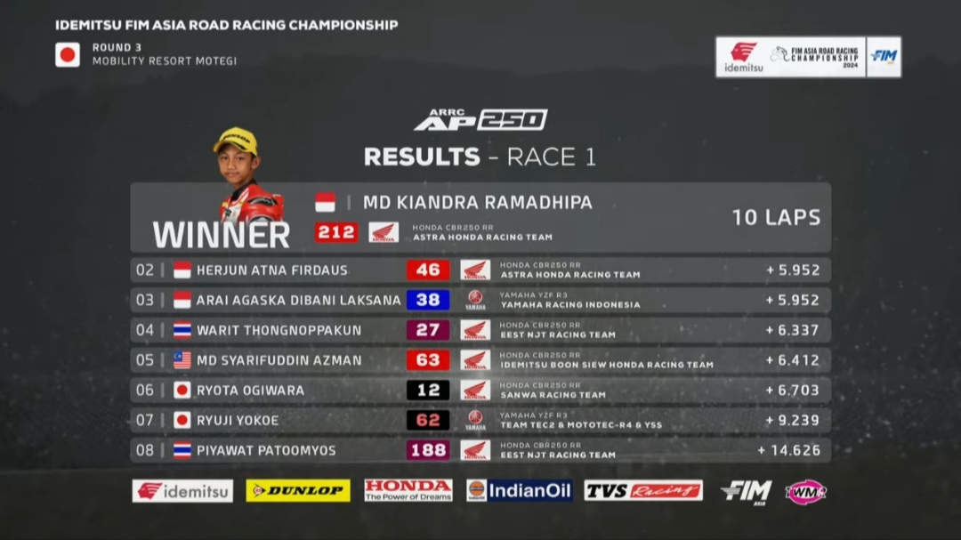 OtomotifZone.com – Jepang. Race selanjutnya yang ditunggu penggemar kelas AP250. Race 1 Asia Road Racing Championship sirkuit Motegi Jepang 8 Juni 2024 rata-rata juga di kuasai pembalap Indonesia. Sesi practice saja Faerozi, Rama dan Herjun menguasai full. Perjalanan balap agak lain. Faerozi tidak tampak di baris depan grid start. Info terkini dia alami cedera saat kualifikasi pagi. Konsentrasi antara Yamaha Indonesia dan Astra Honda Racing Team saja.